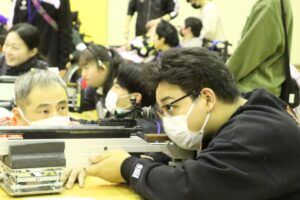 引き金を引く動作が難しい生徒さんには、外部スイッチや声に反応して撃発できる装備を使用し、標的を覗き込むのが難しい生徒さんには、画面上で標的を見やすく確認できるデバイスが使用されました。日常生活でさまざまな制限を受けやすい生徒さんも、自らの意志で標的を射抜く楽しさを分かち合うことのできる機会となりました。