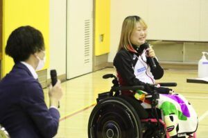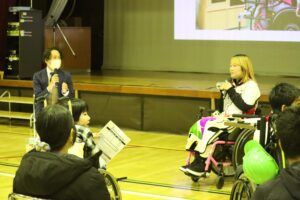 講演会では、水田はミリ単位で点数を競う射撃の知られざる世界や、障害や性別、年齢を超えて人と人がつながる射撃の魅力についてお話ししました。水田は、「好きなことを見つけて、目の前の小さな目標にひとつずつ取り組んで、チャレンジしていってほしい」と生徒さんにエールを送っていました。